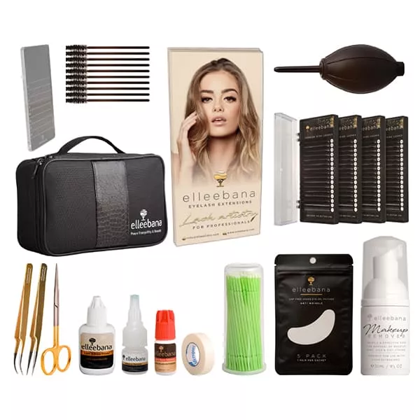 Contains: 5ml Lash Extension adhesive, 3 x trays of lashes (total of 9000+ lashes), Air blower, debonder, Primer, eye pads, adhesive stickers 10 pack, master lash palette, pack of 10 mascara wands, tape, 125ml Elleebana make Up Remover, microbrushes, scissors, 2 x tweezers promotional flyers and Elleebana bag