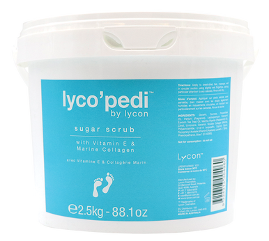 Effectively exfoliates and removes dead skin cells without harsh scratching. The lyco’pedi Sugar Scrub is oil-free, will not stain towels and conveniently does not scatter all over the salon as you work. This exquisite natural formula helps banish calluses and dry rough skin, to reveal brighter younger looking feet that feel silky smooth and invigorated. Lemon Tea-Tree and Peppermint essential oils hygienically refresh feet and fight odours. Marine Collagen for smoothing hydration, Vitamin E to moisturise and Sugar Crystals for natural exfoliation. lyco’pedi Sugar Scrub is plastic bead free.
