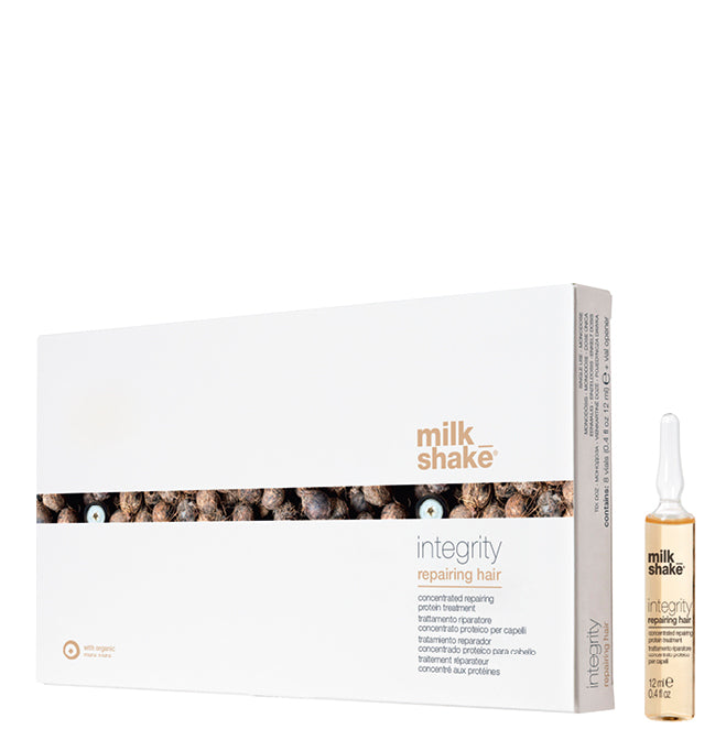 Milk_Shake Integrity Repairing Hair Treatment contains a concentrated repairing protein solution with amino acids to restructure and strengthen damaged and chemically treated hair, leaving it soft and shiny. With organic murumuru butter to condition and nourish the hair.